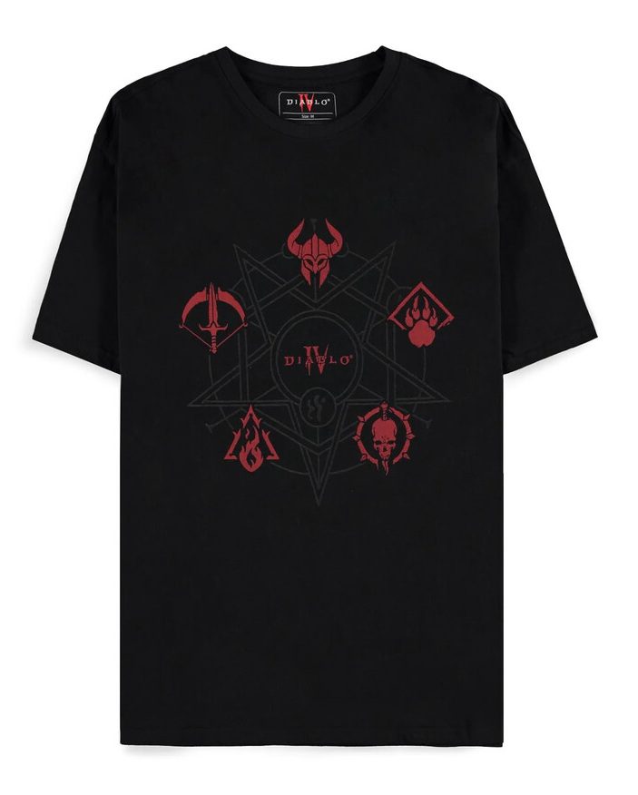 Originalna Diablo IV majica s motivom Class Icons, 100% pamuk, kratki rukavi, crne boje.