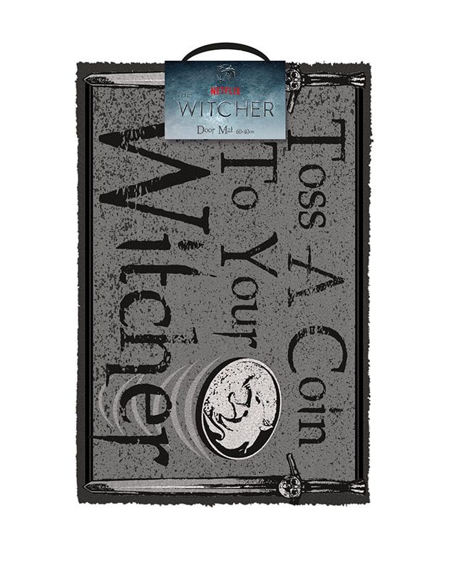 Originalni The Witcher otirač s motivom Toss a Coin to Your Witcher. Dimenzije otirača 40cm (visina) i 60cm (dužina), a materijal 70% kokosova vlakna i 30% PVC (gumirano dno).